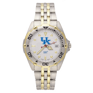 The men's University of Kentucky all star watch has a brushed chrome finish case with a rotating two-tone bezel. Matching two tone stainless steel bracelet. The All-Star features a precision Miyota® quartz movement, distinguished dial face, with the team logo on the top half and team name on lower half of dial, date window, raised luminous hour, minute and second hands, and the crystal is mineral glass. Water resistant. Packaged in an attractive silver tin. Two year limited warranty.