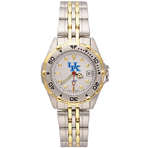 University of Kentucky ladies' All Star watch has a brushed chrome finish case with a rotating two-tone bezel and matching two tone stainless steel bracelet. The All-Star features a precision Miyota® quartz movement, distinguished dial face, with the team logo on the top half and team name on lower half of dial, date window, raised luminous hour, minute and second hands, and the crystal is mineral glass. Water resistant. Packaged in an attractive silver tin. Two year limited warranty.
