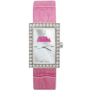Ole Miss starlette watch has a genuine mother of pearl dial and pink leather strap in crocodile embossed pattern. Adorned with 40 cubic zirconias, the case is powered by a Citizen® quartz movement. Packaged in designer LA LA LA box. Two year limited warranty.