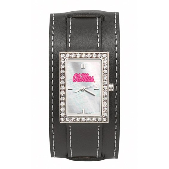 Ole Miss wide starlette watch has a black leather strap. School logo is featured in vibrant color on a genuine mother of pearl dial. Adorned with 40 cubic zirconias, the case is powered by a Citizen® quartz movement. Wide black leather strap. Packaged in designer LA LA LA box. Two year limited warranty.