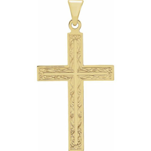 This large solid 14k yellow gold cross has an intricate engraved design. Dimensions: 28x18mm. This cross ls larger than a quarter and it fits up to a 3mm wide chain. Flat back. Approximate weight: 1.34 grams. Made in USA.