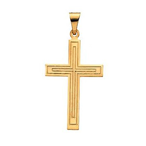 Polished 14k yellow gold cross pendant has double outlines. Dimensions: 28x18mm without bail. This item is slightly larger than a quarter. Fits up to a 3mm wide chain. Weight: 1.40 grams. Please note: weight is approximate, actual weight may vary. Chain not included.