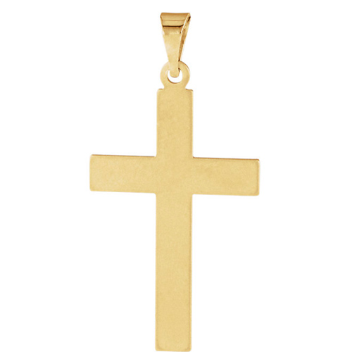 Polished 14k yellow gold cross pendant has a ridged design. Dimensions: 28x18mm. This item is larger than a quarter. Weight: 1.39 grams. Please note: weight is approximate, actual weight may vary. Chain not included.