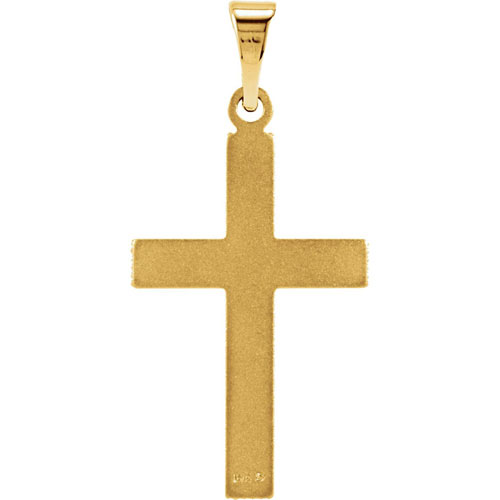 This small 14k yellow gold cross pendant has a grooved design. Dimensions: 18mm x 12mm without bail. This pendant is the size of a dime. Fits up to a 1.75mm wide chain. Weight: 0.62 grams. Please note: weight is approximate, actual weight may vary. Available while supplies last.