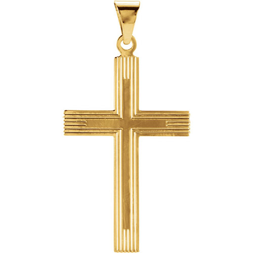 This men's grooved cross pendant is made of polished solid 14k yellow gold. Dimensions: 28x18mm. This pendant is slightly larger than a quarter. Fits up to a 3mm wide chain. Approximate weight: 1.34 grams.