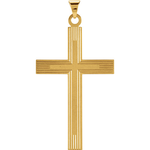 This men's large grooved cross pendant is made of 14k yellow gold. Polished finish. Dimensions: 1in x 1.5in. This cross is larger than a half dollar. Weight: 2.42 grams. Please note: weight is approximate, actual weight may vary. Chain not included. Bail dimensions: 2.75mm x 4mm. We recommend a chain no wider than 2.0mm.