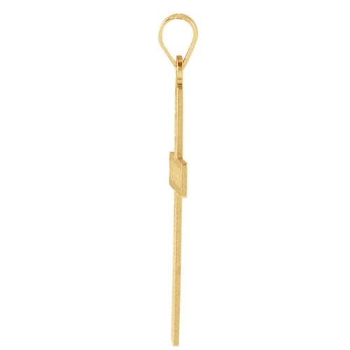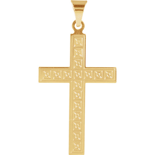 This large solid 14k yellow gold Latin cross has tiny squares. Engraved design. Dimensions: 28x18mm. This item is slightly larger than a quarter. Fits up to a 3mm wide chain. Flat back. Approximate weight: 1.3 grams.