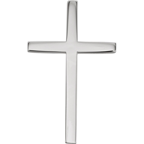 This solid 14k white gold smooth cross pendant has a hidden bail. Item size: 29.5mm x 18.25mm. Fits up to a 3mm wide chain. Polished finish. Weight: 2.8 grams. Please note: weight is approximate, actual weight may vary.