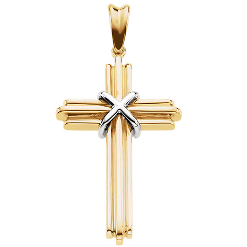 This men's large grooved cross pendant is made of polished solid 14k yellow and white gold. Dimensions: 38.75mm x 23.25mm. Approximate weight: 8.46 grams. Bail dimensions: 5.5mm x 3.25mm. Fits up to a 3mm wide chain.