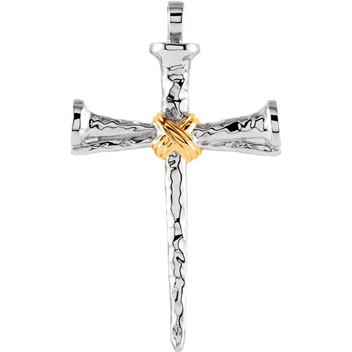 Polished solid 14k white gold nail cross pendant has a 14k yellow gold wrapped center. Dimensions: 1 3/8in x 2in. Fits up to a 4mm wide chain. Approximate weight: 11.6 grams.