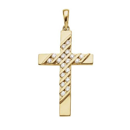 This 14kt yellow gold cross is adorned with 18 round full cut diamonds. Each channel set diamond weighs .02 ct, color H-I, clarity SI. Item size: 28mm x 18mm, larger than a quarter. Weight: 2.51 grams. Please note: weight is approximate, actual weight may vary. Made in the USA.