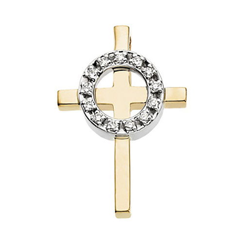 Polished 14kt yellow and white gold. 1/8 CT TW diamonds: 13 round full cut diamonds, color H-I, clarity SI. Item size: 38.5x28.5mm. Weight: 2.31 DWT (3.59 grams) Please note: weight is approximate, actual weight may vary. Chain not included.