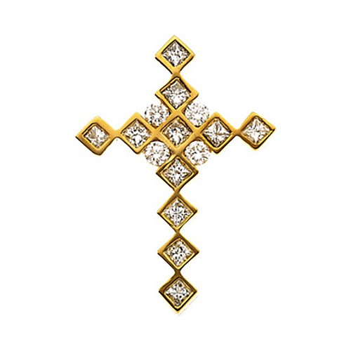 This solid 14k yellow gold cross pendant has 4/5 carat total weight round and princess cut diamonds. Pendant size: 28mm x 20mm. 4 x .06CT round full cut diamonds, 11 x 2mm princess cut diamonds, color H-I, clarity SI. Hidden bail. Approximate weight: 3.59 grams.