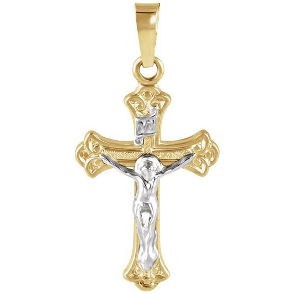 Budded INRI crucifix pendant is made of polished 14k yellow and white gold. Dimensions: 19mm x 13mm without bail. Fits up to a 3mm wide chain. Weight: 0.96 grams. Please note: weight is approximate, actual weight may vary.