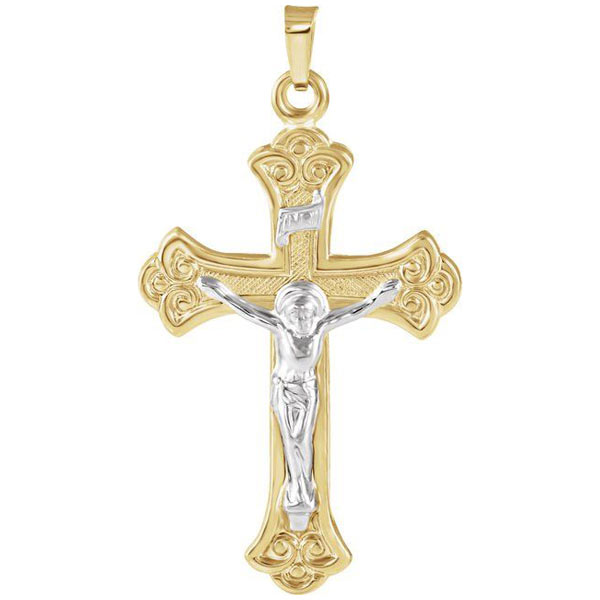 Polished 14k yellow and white gold INRI crucifix features budded cross tips. Dimensions: 33x23mm. This item is slightly larger than a half dollar. Weight: 2.16 DWT (3.36 grams) Please note: weight is approximate, actual weight may vary. Chain not included.