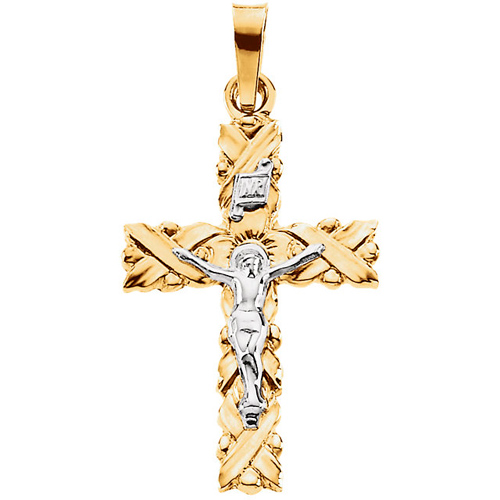 This jumbo INRI crucifix is made of 14k yellow and white gold. Textured and wrapped design. Weight: 5.96 grams. Please note: weight is approximate, actual weight may vary. Chain not included. Fits up to a 4mm wide chain. Made in USA.