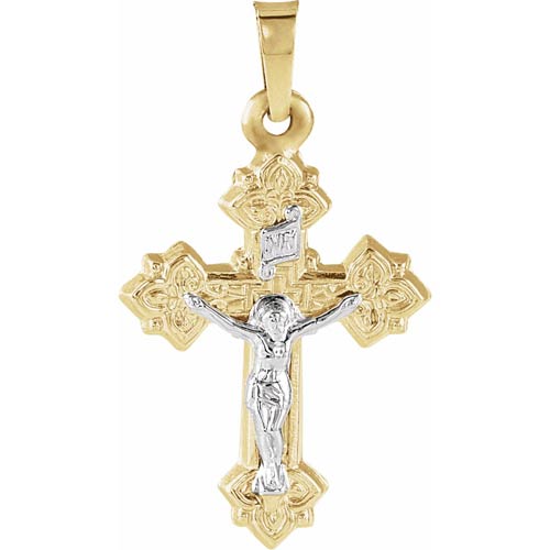 This ladies' 14k yellow and white gold crucifix pendant is hollow. Dimensions: 5/8in x 3/4in. This pendant is the size of a penny. Fits up to a 3mm wide chain. Weight: 0.82 grams. Please note: weight is approximate, actual weight may vary. Chain not included. Made in USA.