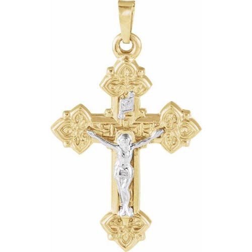 This men's 14k yellow and white gold fleur de lis crucifix pendant is hollow. Dimensions: 3/4in x 1in. Fits up to a 3mm wide chain. Weight: 1.35 grams. Made in USA.