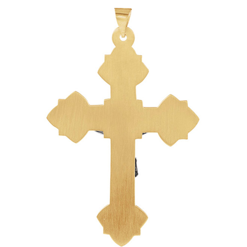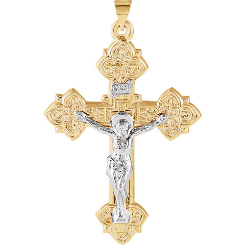 This large men's hollow crucifix pendant is made of polished 14k yellow and white gold. Item size: 25mm x 33mm without bail. This pendant is about the size of a half dollar. Fits up to a 4mm wide chain. Approximate weight: 2.14 grams. Please note: weight is approximate, actual weight may vary. Chain not included.