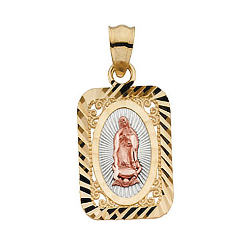 This rectangular Lady of Guadalupe medal is made of solid 14k yellow, white and rose gold. Dimensions: 21.5mm x 15mm. This item is slightly smaller than a nickel. Weight: 2.21 grams. Please note: weight is approximate, actual weight may vary.