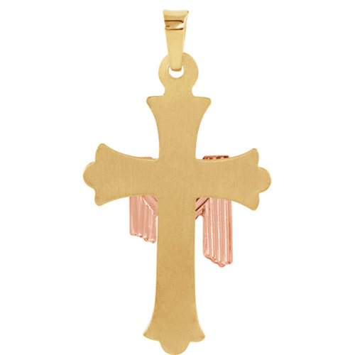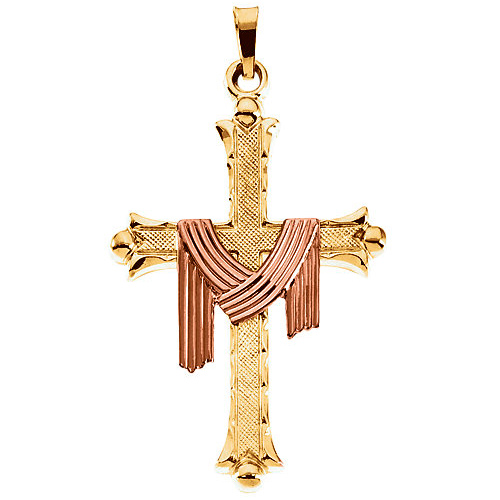 Cross with robe pendant is made of polished 14k yellow and rose gold. Hollow. Dimensions: 25.5x18mm. The hallmark is on the bail. Weight: 1.20 grams. Please note: weight is approximate, actual weight may vary. Chain not included.