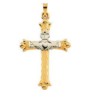 Hollow, polished 14kt yellow and white gold. The heart is for love; the crown, loyalty; and the hands, friendship. Weight: 1.00 DWT (1.56 grams) Please note: weight is approximate, actual weight may vary. Chain not included.