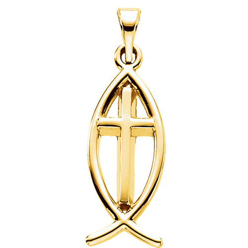 Fish ichthus pendant with cross is made of polished solid 14kt yellow gold. Dimensions: 17mm x 8mm. Weight: 1.00 grams. Please note: weight is approximate, actual weight may vary. Chain not included.