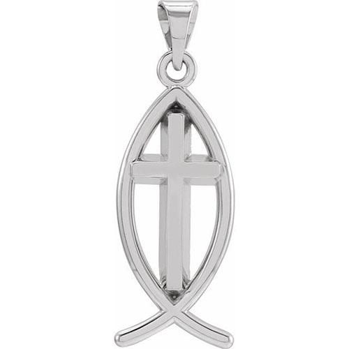 Ichthus pendant is made of polished 14kt white gold. Dimensions: 19mm x 9mm. This item is the size of a penny. Weight: 1.30 grams. Please note: weight is approximate, actual weight may vary. Chain not included.
