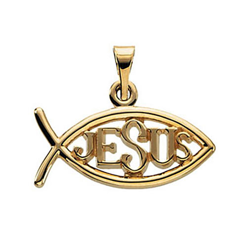 Jesus ichthus pendant is made of Polished solid 14kt yellow gold. Approximate weight: 0.94 grams. This item is smaller than a dime. Fits up to a 2mm wide chain. Made in USA.