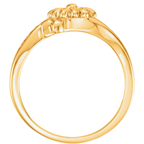 Floral LOVE WAITS ring is made of polished solid 10k yellow gold. Ring features a flower in the center. Standard fit. Weighs 4.29 grams. Please note: weight is approximate, actual weight may vary.