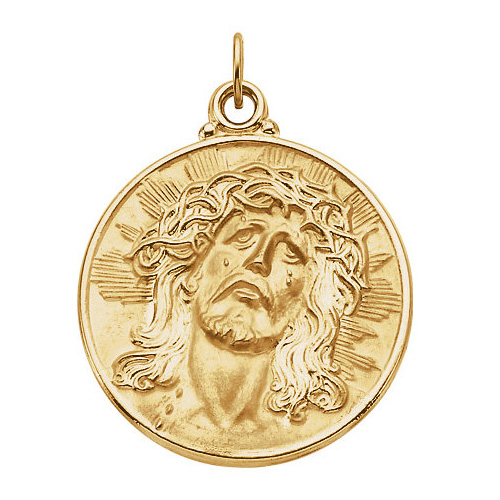 This round face of Jesus medal is made of polished solid 14k yellow gold. 21mm diameter. No inscription. This medal is the size of a nickel. Fits up to a 2.5mm wide chain. Weighs 4.30 grams. Made in USA.