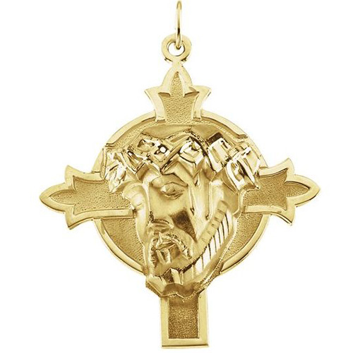 Hollow face of Jesus cross pendant is made of polished 14k yellow gold. Dimensions: 22.5mm x 21.5mm. Fits up to a 2mm wide chain. Approximate weight: 1.5 grams.
