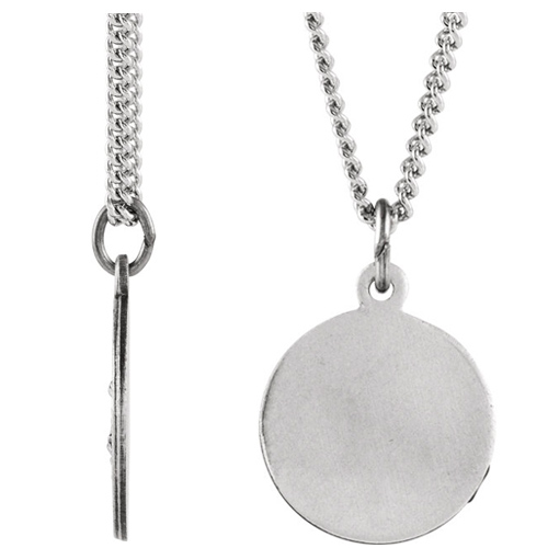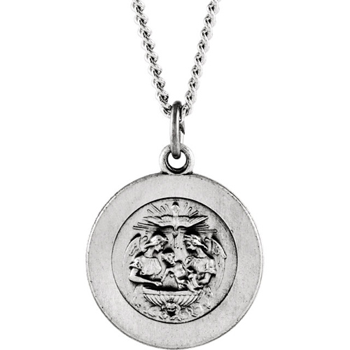 This ladies' solid sterling silver 3/4in baptismal medal dangles from a sterling silver 18-inch rope chain. No inscription. Weighs 2.32 grams. Please note: weight is approximate, actual weight may vary.