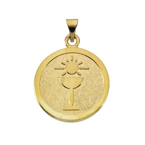 This round Holy Communion medal is made of solid 14k yellow gold. 23mm diameter. No inscription. Fits up to a 3mm wide chain. Weighs approximately 5.76 grams.