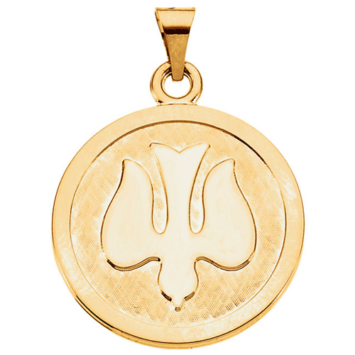 This round holy spirit dove medal is made of polished solid 14k yellow gold. 23mm diameter. No inscription. Fits up to a 3mm wide chain. Approximate weight 5.89 grams. Made in USA.