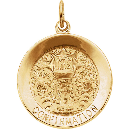 This round confirmation medal is made of solid polished 14k yellow gold. Round, 18mm diameter. This item is the size of a dime. Inscription reads CONFIRMATION. Weighs 2.35 grams. Please note: weight is approximate, actual weight may vary. Chain not included. Made in USA.
