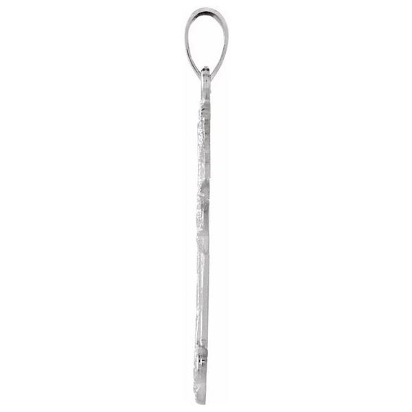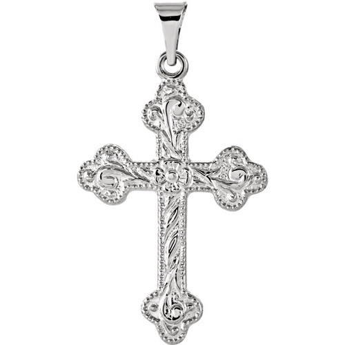 Intricately detailed budded floral cross is made of polished solid 14k white gold. This cross pendant is slightly larger than a nickel. item size: 23.5mm x 17mm. Fits up to a 3mm wide chain. Approximate weight: 1.79 grams.