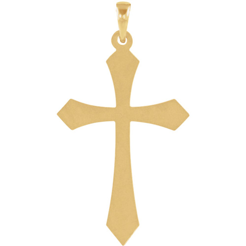 Passion cross pendant is made of polished 14k yellow gold. Dimensions: 32mm x 21mm. Weight: 2.04 grams. Please note: weight is approximate, actual weight may vary. Chain not included. Fits up to a 3.5mm wide chain. This item is slightly larger than a quarter.