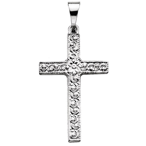 14k white gold floral cross has a vine motif and polished, textured finish. Item size: 3/4in x 5/8in without bail. Weight: 0.73 grams. Please note: weight is approximate, actual weight may vary. Chain not included.