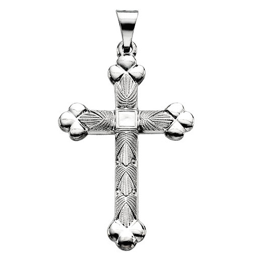 Budded cross is made of polished solid 14k white gold. Dimensions: 32mm x 22mm. Fits up to a 2.7mm wide chain. Polished ends and textured arms. Weight: 2.86 grams.