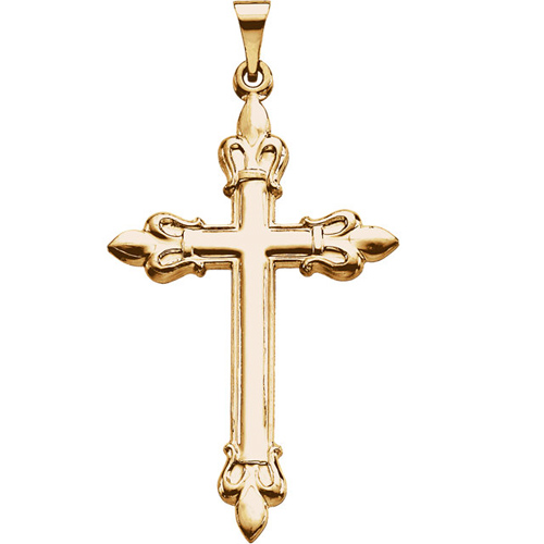 Fleur de lis cross pendant is made of polished solid 14k yellow gold. Dimensions: 35x23mm. Fits up to a 2mm wide chain. Weight: 2.86 grams. Please note: weight is approximate, actual weight may vary. Available while supplies last.