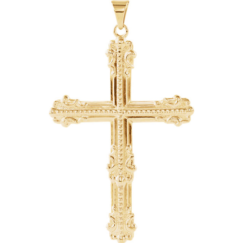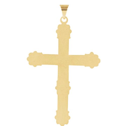 Large fancy cross pendant is made of polished solid 14k yellow gold. Dimensions: 44mm x 31.5mm. Weight: 4.32 grams. Please note: weight is approximate, actual weight may vary. Chain not included.