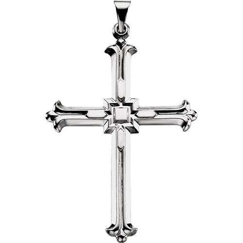 This large 14k white gold budded cross pendant has a square in the center. Pendant size: Dimensions: 42.5mm x 31.5mm. Bail size: 2.8mm x 3.5mm. Chain not included. We recommend a chain no wider than 2.25mm. Weight: 4.94 grams. Please note: weight is approximate, actual weight may vary. Made in USA.