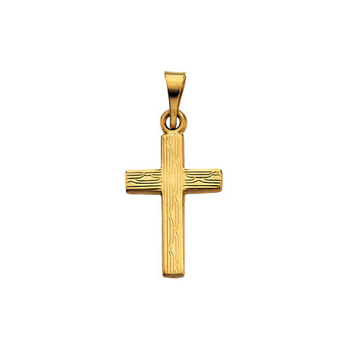 This very small woodgrain cross pendant is made of polished solid 14k yellow gold. Item size: 14.5mm x 10mm. Fits up to a 2mm wide chain. Weight: 0.64 grams. Please note: weight is approximate, actual weight may vary. Chain not included.