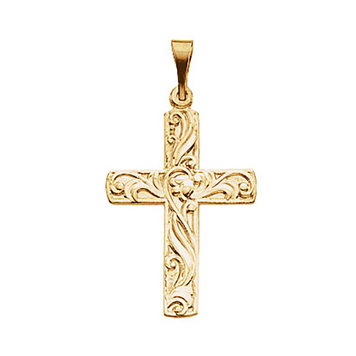 Fancy flowers and stems cross pendant is made of polished solid 14k yellow gold. Item size: 20.5x15mm. Approximate weight: 0.84 grams. Tapered bail fits up to a 2.5mm wide chain.