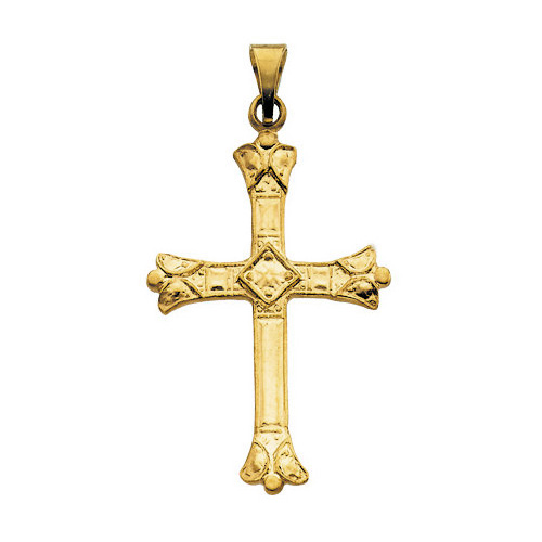 Budded cross pendant is made of polished solid 14k yellow gold. Dimensions: 28x19mm. Approximate weight: 1.45 grams. Fits up to a 2.5mm wide chain.