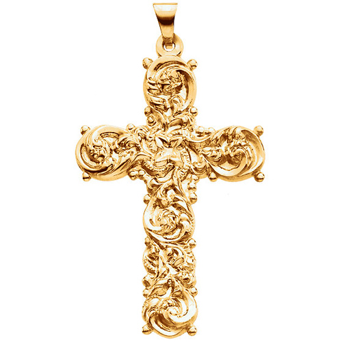 This large and ornate floral cross pendant is made of polished solid 14k yellow gold. Item dimensions: 39mm x 26.5mm. Approximate weight: 6.72 grams. Fits up to a 4mm wide chain.
