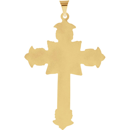 This very large budded cross pendant is made of solid 14k yellow gold. Item size: 1 1/4in x 1 3/4in without bail. Fits up to a 3mm wide chain. Weight: 6.86 grams. Made in USA.