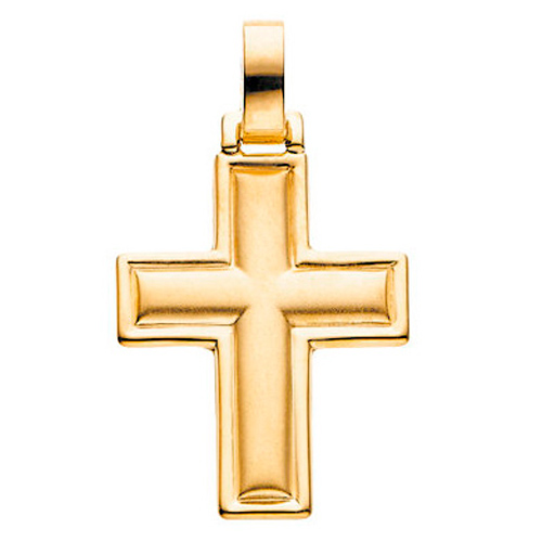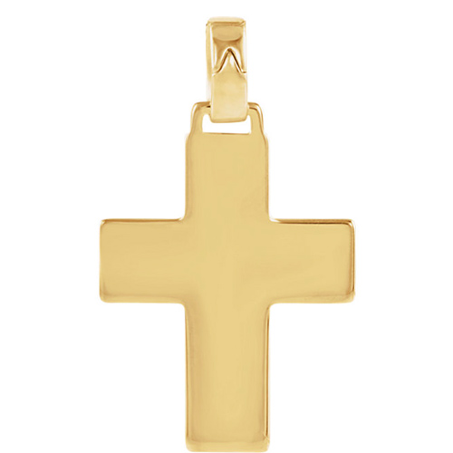 This thick cross pendant is made of polished 14k yellow gold. Hollow. Item size: 22.5mm x 18mm. Bail dimensions: 3.3 x 4.75mm. We recommend a chain no wider than 3mm. Weight: 2.95 grams. Please note: weight is approximate, actual weight may vary.