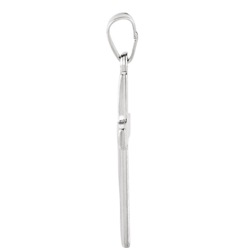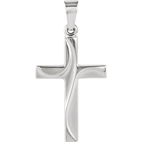Polished solid 14k white gold cross pendant features wavy lines. Dimensions: 21x14mm. This item is the size of a nickel. Fits up to a 2.5mm wide chain. Weight: 0.80 grams. Please note: weight is approximate, actual weight may vary. Chain not included.